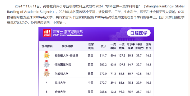 根据中华人民共和国教育部最新的全国学科评估结果,四川大学的口腔医学专业始终稳居“A+”等级,这一评级本身就是其顶尖实力的最权威官方认证。而将目光放眼世界,四川大学的口腔医学显然也是其间佼佼者,在软科世界一流学科排名中,位列世界第四,比哈佛大学略高一筹。