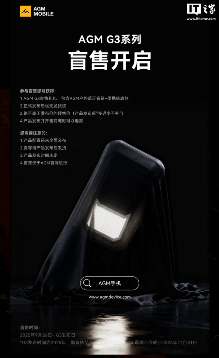 目前,AGMG3已开启盲售(盲售时间为2025年9月26日-G3发布日),新机发布时间为2025年,盲售结束时间/新机发布时间最晚不会晚于2025年12月31日。