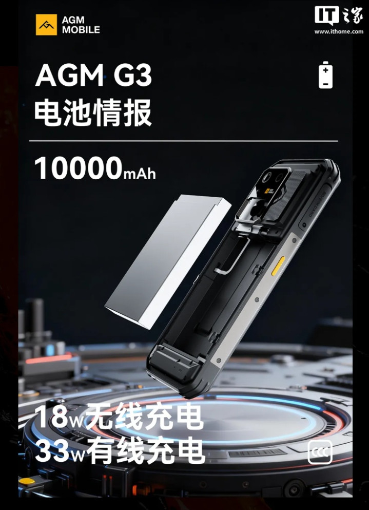 IT之家10月18日消息,AGM手机官方今日宣布,将带来搭载10000mAh电池的AGMG3新机。官方表示,新机在提升电池容量的同时,控制了整机重量,通过立体堆叠工艺避免机身过度厚重(具体数据未公布),配合电池纤维吸附技术,实现零漏液、低析锂,解决了大电池长期使用鼓包风险。